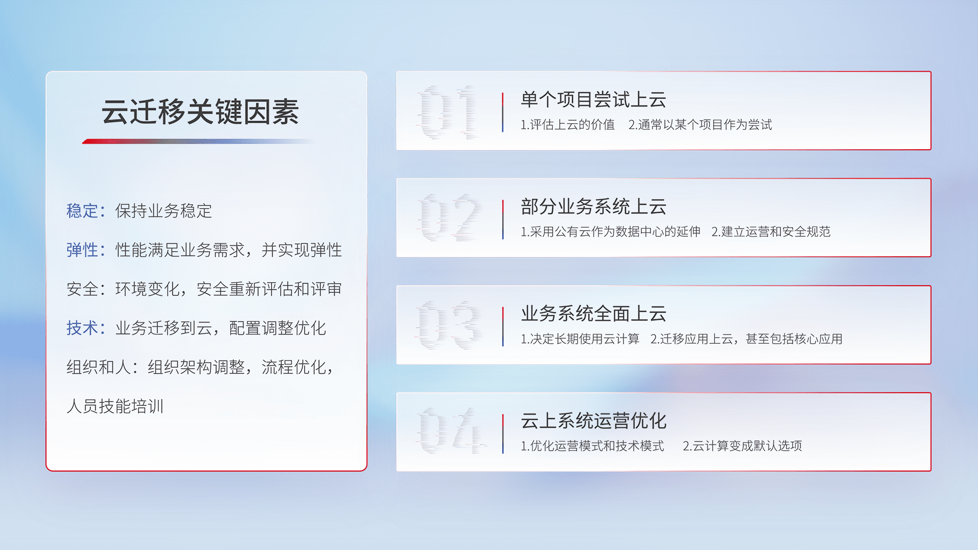 结合实际业务,,从规划设计、、、、云平台选型、、、、云原生改造、、数据迁移、、、、集成交付,,,迁移全过程为客户识别最佳上云路径,,做好风险识别管理,,,,设计网络架构、、、、身份权限、、、安全审计合规、、操作审计、、、、日志审计、、、、监控告警策略、、多站点容灾设计等,,,,对云上基础设施进行整体规划,,,,提升IT治理水平,,以满足弹性、、高可用、、、、高性能的需求。。。