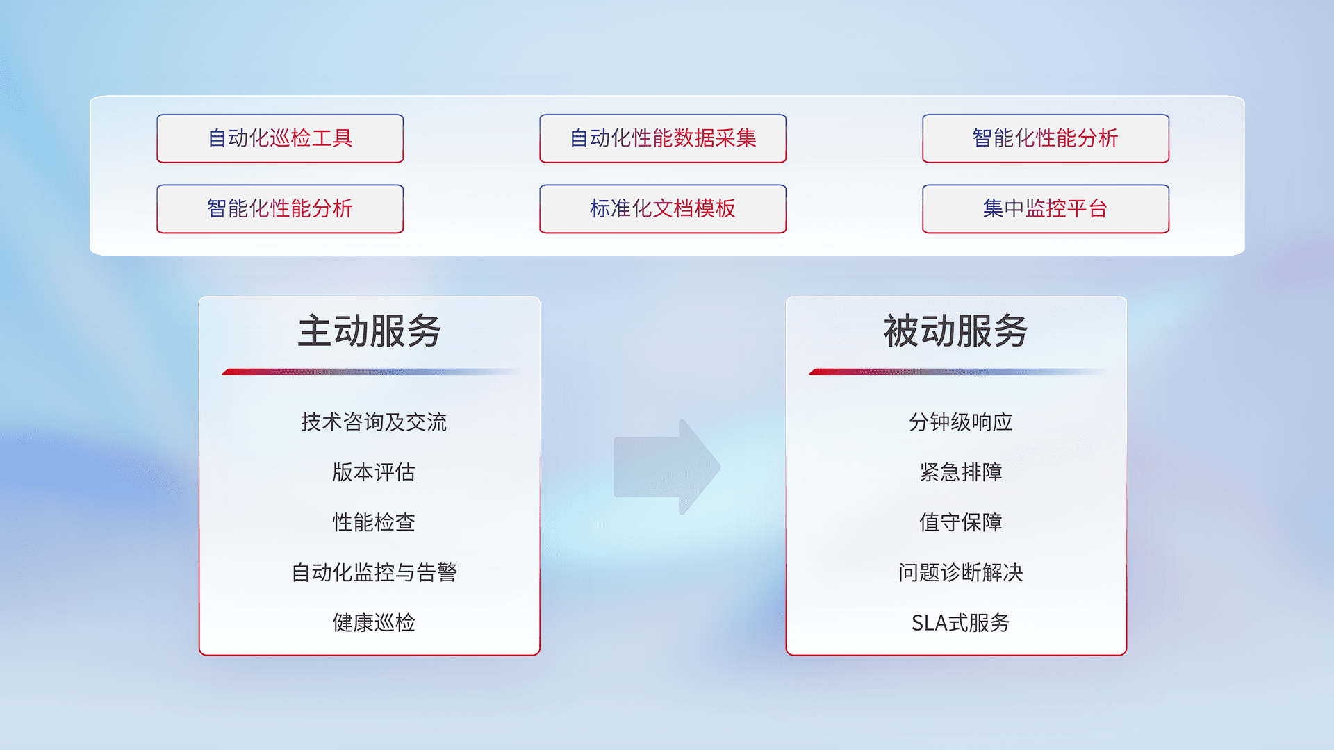 智能化工具和标准化文档,,,,保障服务质量,,,提供主动服务(包含技术咨询、、、、版本评估、、性能检查、、自动化监控与告警、、、、健康巡检)和被动服务包含(分钟级响应、、、紧急排障、、值守保障、、问题诊断解决、、、、SLA服务)。。